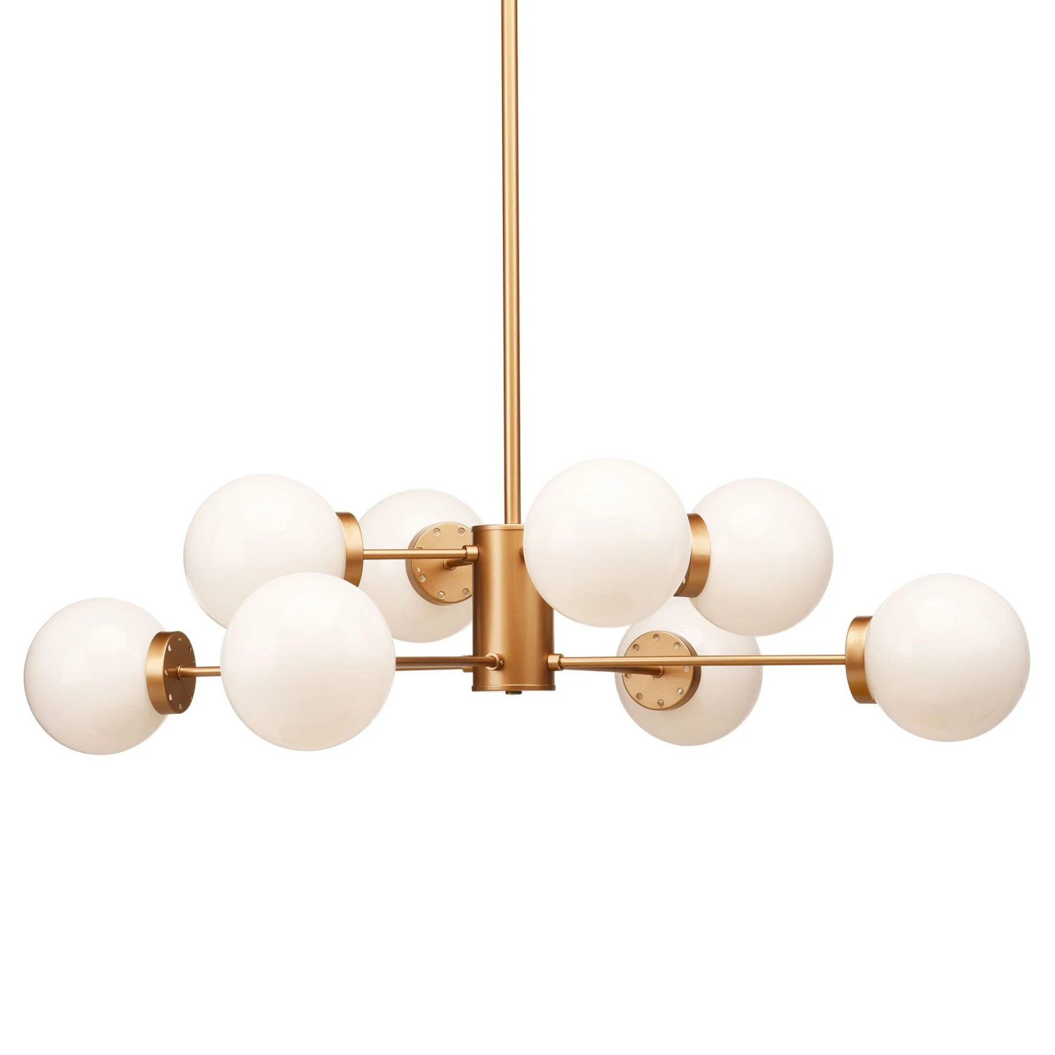 The Dylan Pendant Light from Nuevo is a neo classical chandelier made from a matte gold finished stainless steel frame and matching canopy. The white glass globe shades are 6 inches in diameter and require 8 E12 small base 25 watt max bulbs (bulbs not included).