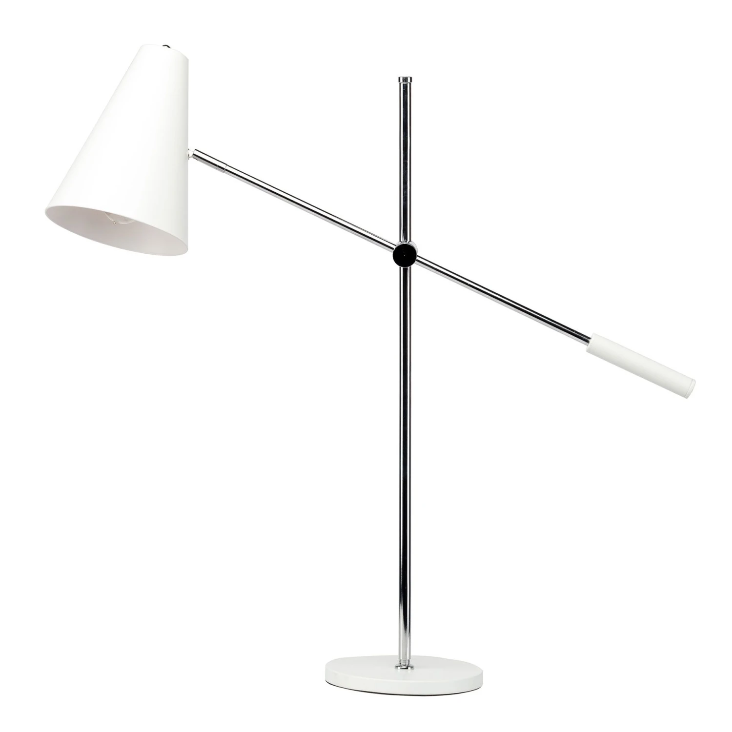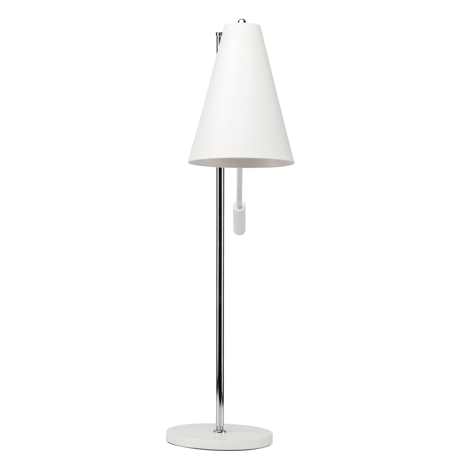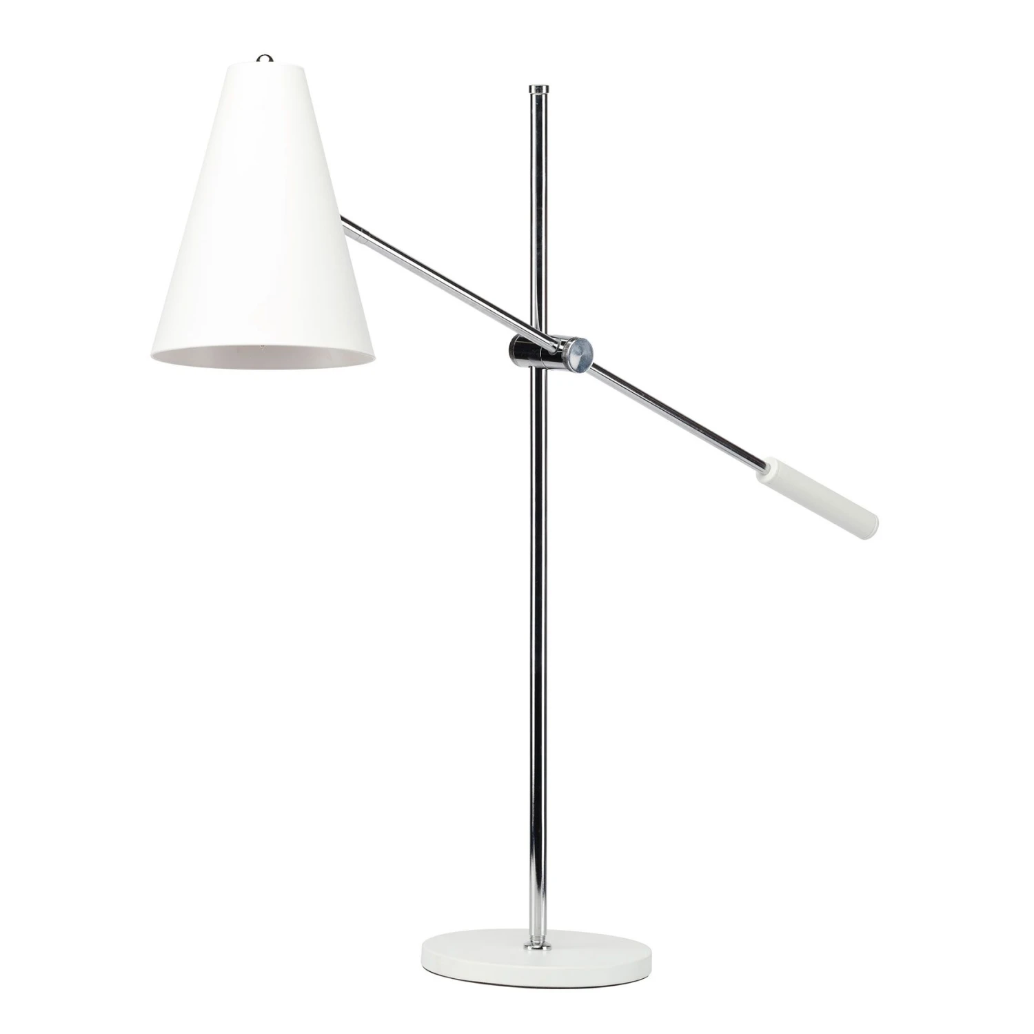 The Tivat Table Lamp from Nuevo is a contemporary desk or table lamp with a levered adjustable arm. Made from chrome finished steel. With a white painted metal shade and base, the lamp is rated for a 60 watt maximum bulb. With an in line on / off switch.