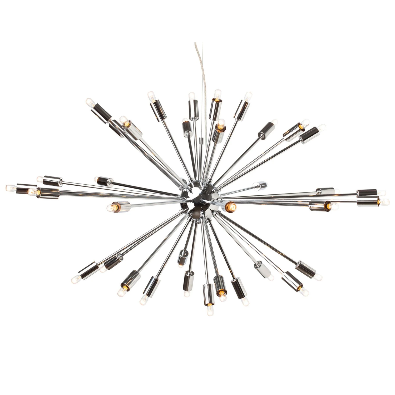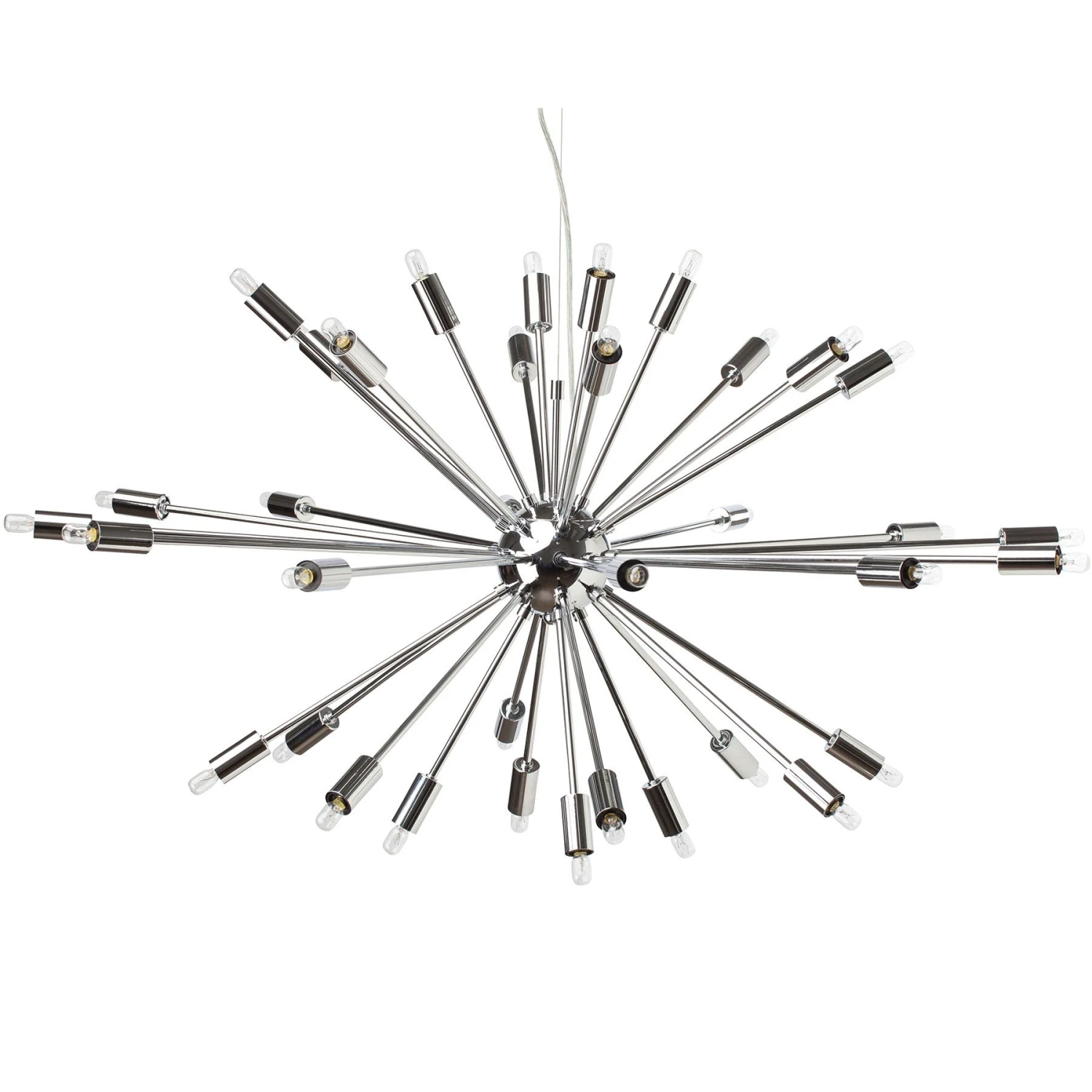 The Vladimir Pendant from Nuevo is a “Sputnik” inspired design with a chromed steel fixture, matching chrome canopy, and clear power cable. The overall height is adjustable to a maximum of 122.25″. Requires 36 E12 small base 25 watt max bulbs (bulbs ARE included).